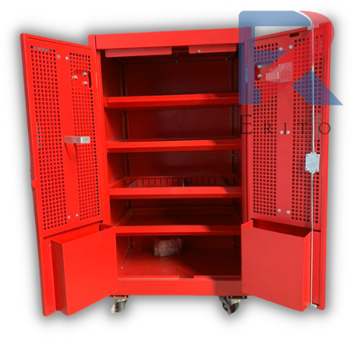 - Tủ chứa đồ nghề với thiết kế 5 ngăn chính, 2 cánh mở có giá treo và hộc phụ.