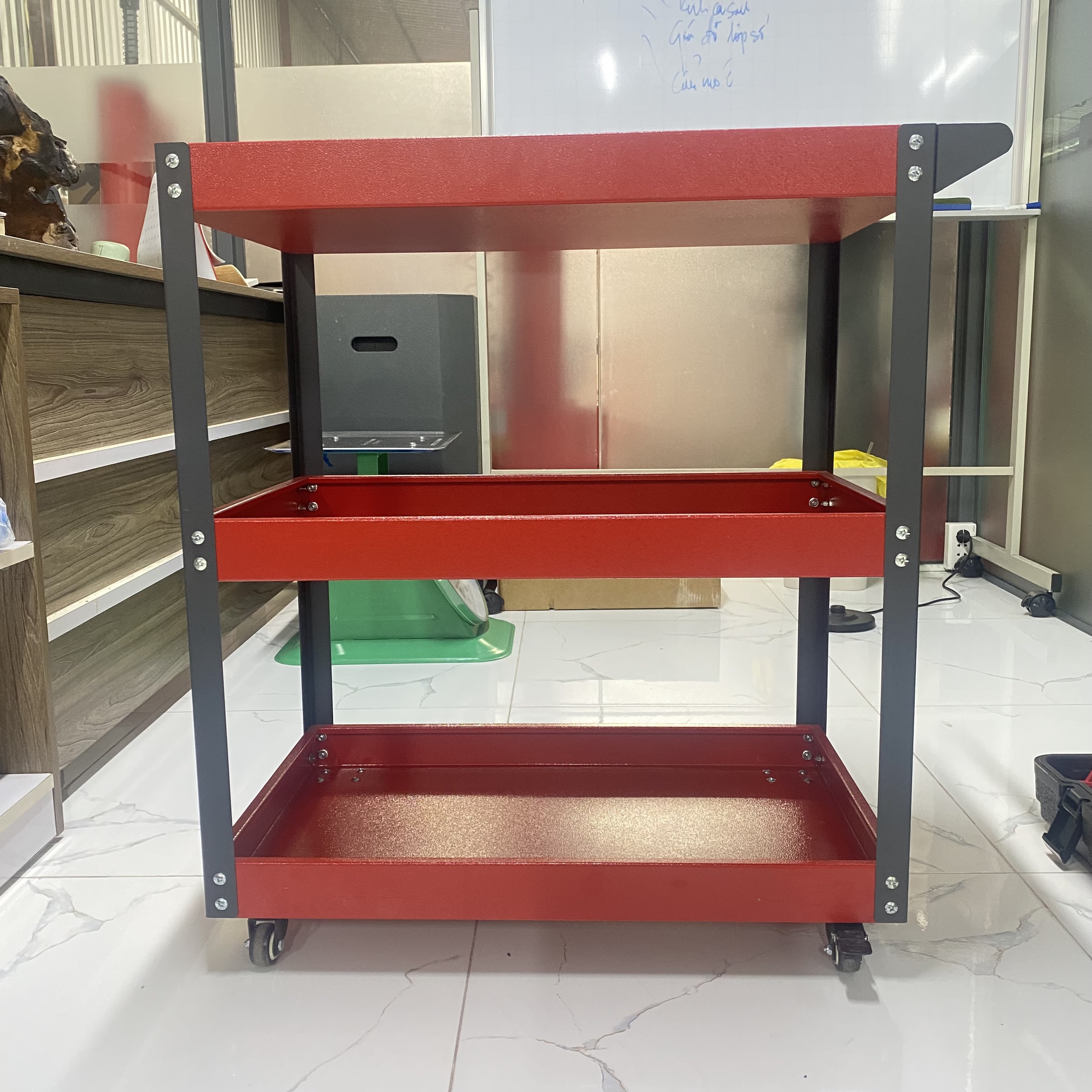 Thiết kế 3 tầng tiện ích: Xe đẩy nên có thiết kế 3 tầng để bạn có thể sắp xếp và di chuyển các dụng cụ và linh kiện một cách dễ dàng. Mỗi tầng nên có đủ không gian để chứa các đồ vật khác nhau mà không gây rắc rối.